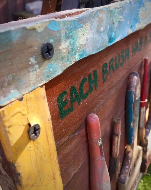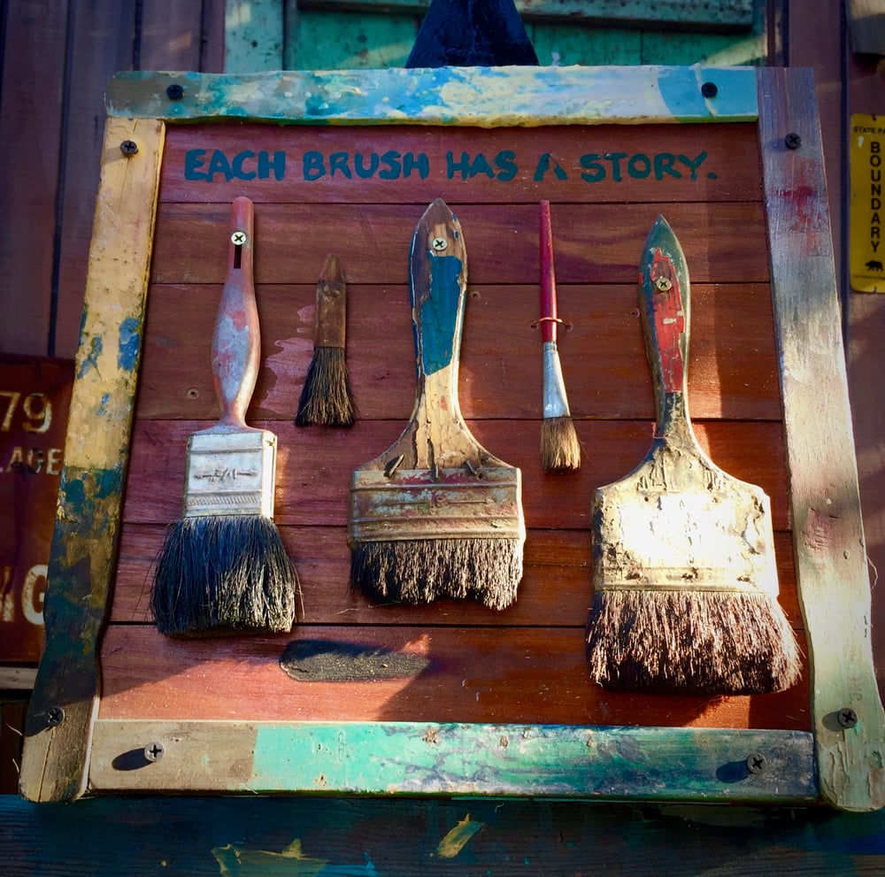 This artwork is made for artists, and painters specifically! If paint brushes could talk, imagine the stories they'd tell of where they've been, what they've painted, what colors they've been in! "EACH BRUSH HAS A STORY." Especially THESE, salvaged from an old western ghost town. This piece is constructed of a reclaimed cabinet from an old farmhouse as a backdrop, and blocks of wood in the back to reinforce the piece. There are 5 different paint brushes of different sizes and dried paint remnants stuck on them, each having a character of their own. The border is lined with old paint stir sticks, with layers of history in multiple colors. Dimensions 13 3/4" x 13 3/4" 1 3/4" wide