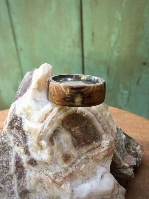 We named this the P.O.W.Z rustic ring, because this ring contains "P"ine, "O"ak, "W"alnut, and "Z"ebra woods. Left over from another project (as most of are material is), we decided to recycle these woods instead of toss them in the trash. The wood was stacked, clamped and glued, and when dry, put on the lathe and hand turned into a woodsy, rustic looking piece of art! Somebody is sure to ask where you got this amazing piece on you finger. Size 13, 8mm wide. Water resistant. Need a different ring size (6-12 and half sizes, too)? Leave us a note with your purchase or contact us prior!